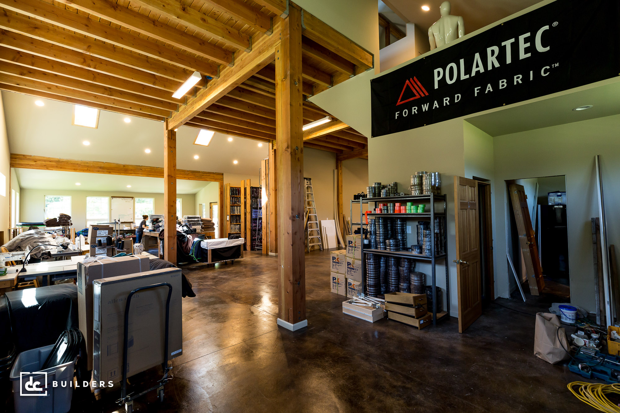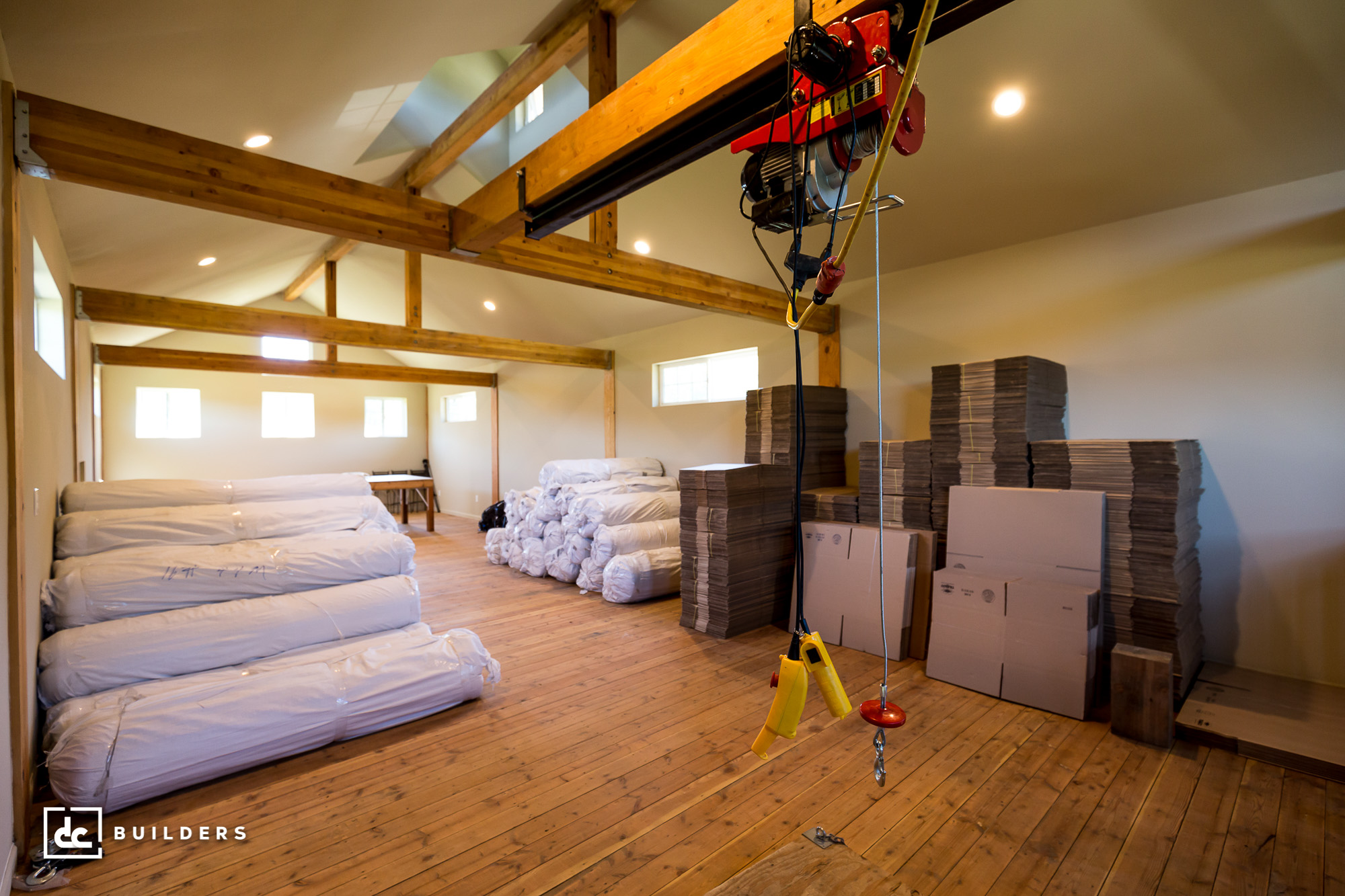Designed by DC Builders, this monitor-style barn in Fall City, Washington is home to a small manufacturing business. This heavy-duty workshop features major engineering upgrades, including a heavy timber framed center aisle loft and double wall construction for all exterior walls. The reinforced loft provides a safe workspace for heavy equipment.