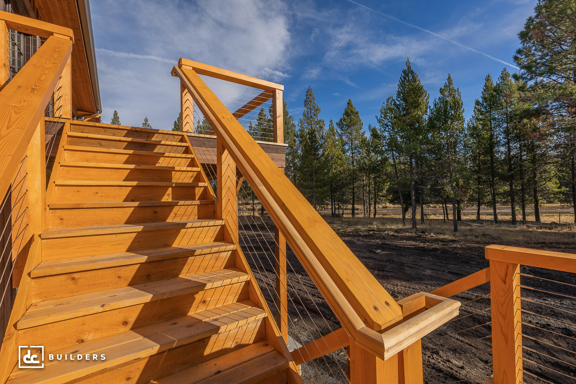 Modifications to the original model include reducing the roof pitch from 4/12 to 3/12, extending the deck from 196 square feet to 335 square feet, and adding a 784 sq. ft. shed roof for RV storage. For visual appeal, our clients also added a 72 sq. ft. covered entry with a decorative timber truss and a 12′ mortise and tenon radius bottom chord timber truss to the front gable. The exterior features cedar board and batten siding and Andersen™ 100 Series windows designed with tempered glass and a colonial window grid. Upstairs, our clients replaced the standard Andersen™ 100 Series sliding glass door with an Andersen™ A Series French door upgrade.