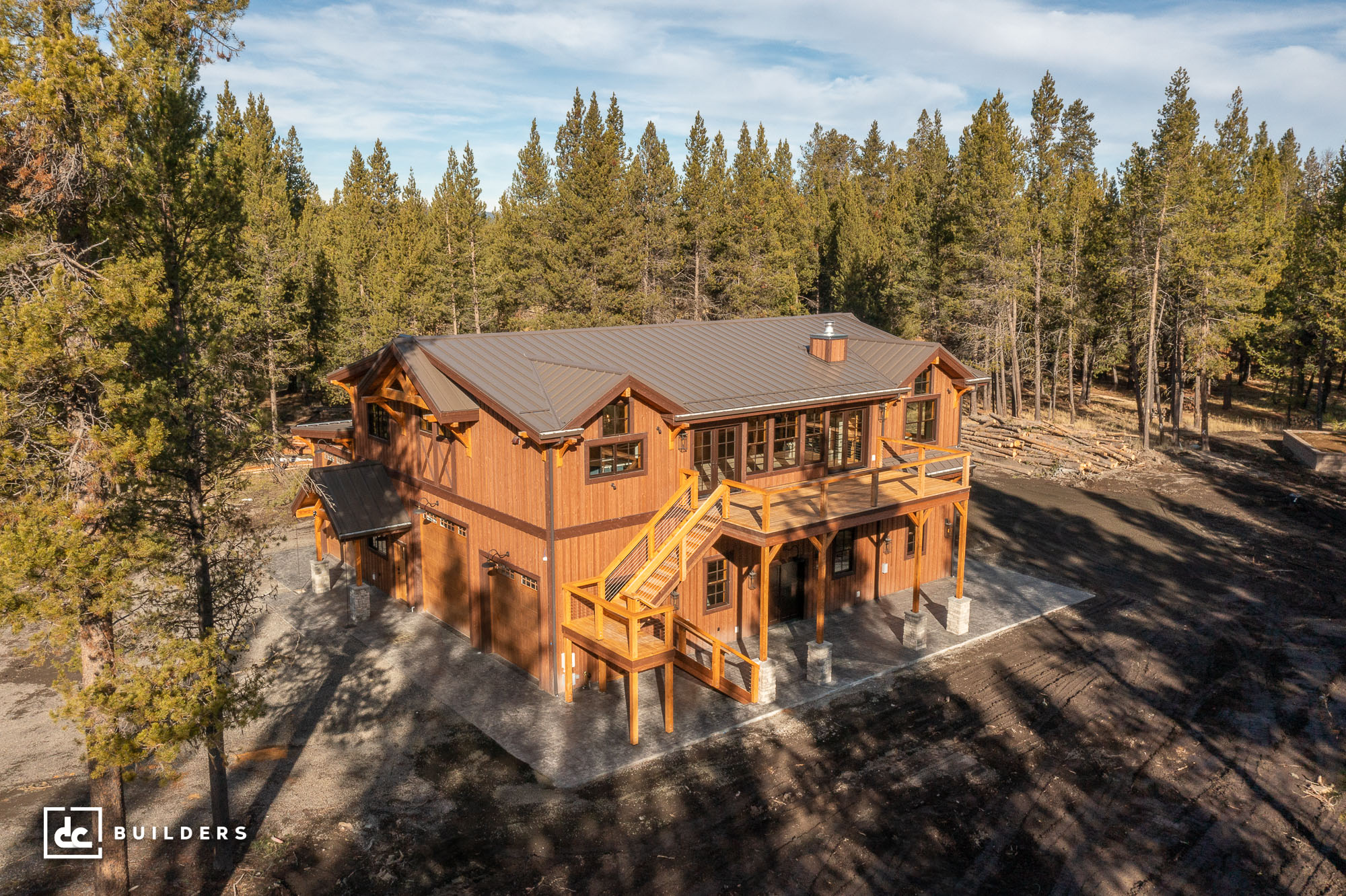 This multipurpose structure in Bend, Oregon combines work and leisure under one roof. Based on a Shasta RV Barn Kit from DC Structures, this unique post and beam building features a large garage area with ample room for vehicles and storage on the main level, along with a connecting foyer and enclosed shed roof that serves as an RV garage bay. Upstairs, the main living area functions as a gathering space with a wet bar, gas fireplace, and access to a 335 sq. ft. deck. Additionally, our clients can take advantage of two offices with a shared bathroom and a craft room with a storage closet and private bathroom on the second story.