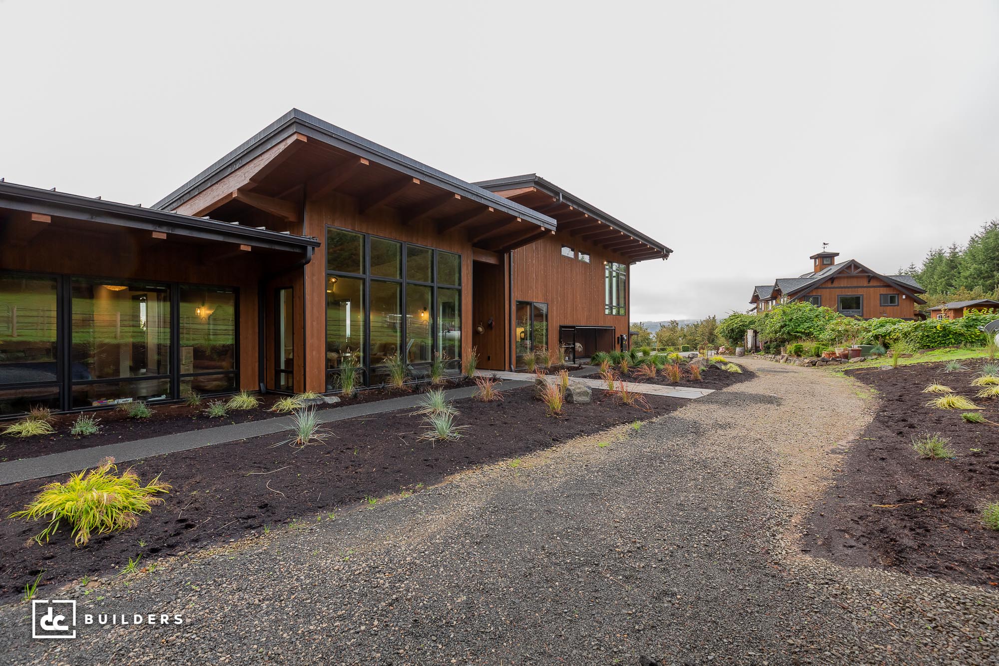 Located on a scenic hazelnut farm in Cornelius, Oregon, this heavy timber custom home features a forward-looking design as stunning as its property views. Sloped rooflines and glass curtain walls throughout give this home a distinctly modern feel, along with a litany of special features that bring this 4,098 sq. ft. timber frame residence into the 21st century. Oversized heavy timbers were used to frame the residence and grand entrance, providing for a difference you can see and feel throughout. Inside, custom selections including polished concrete flooring and a double-sided wood burning fireplace add to the originality of this custom home design.