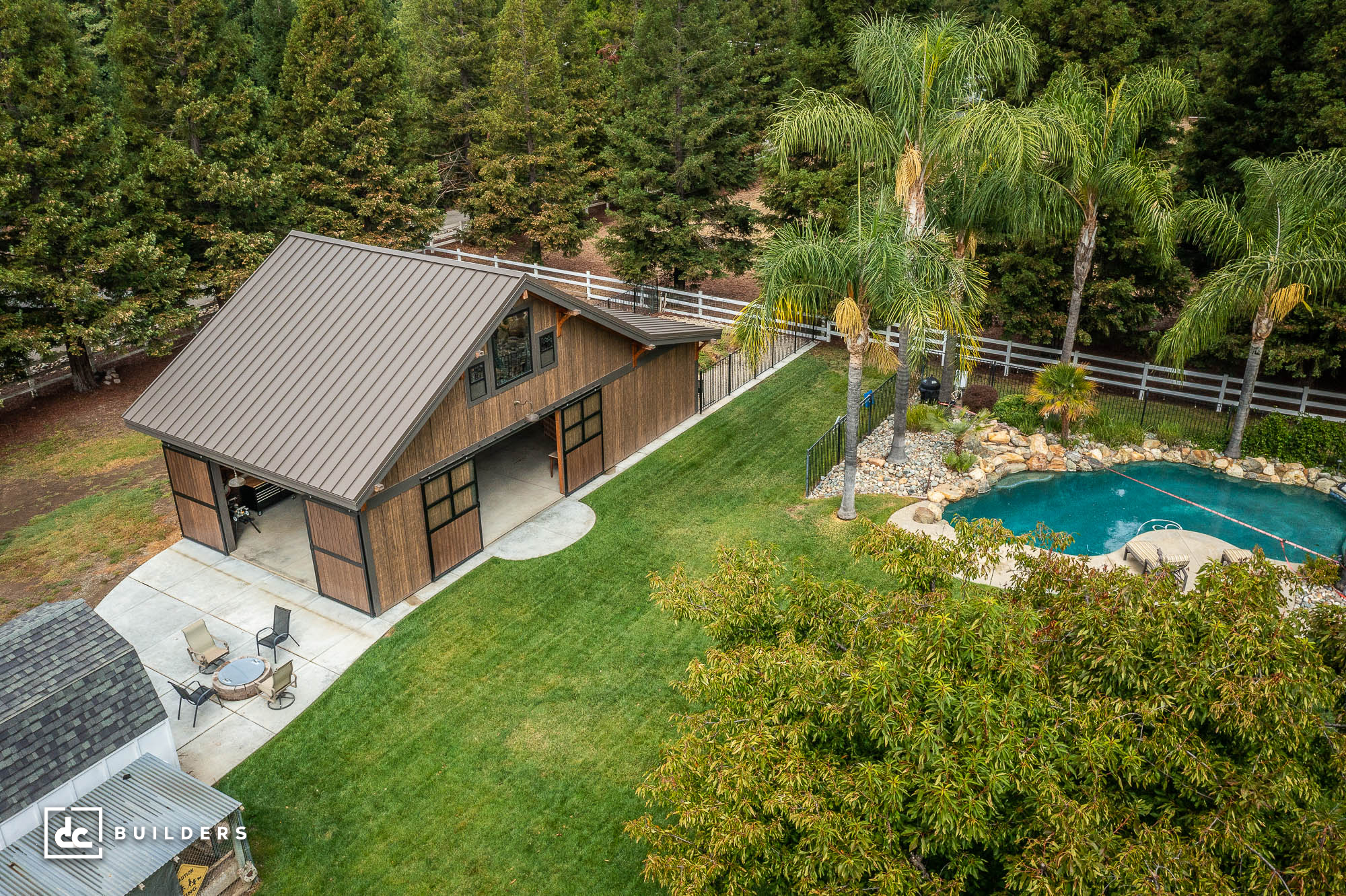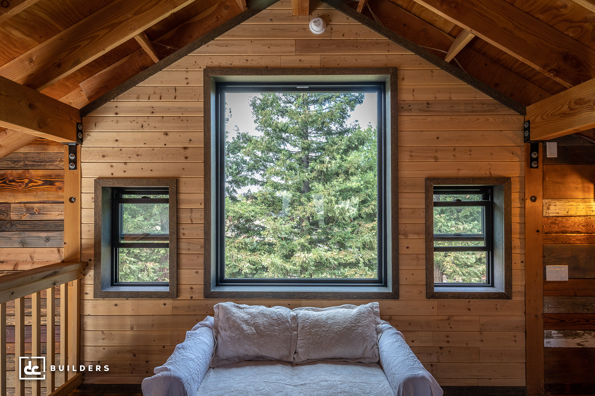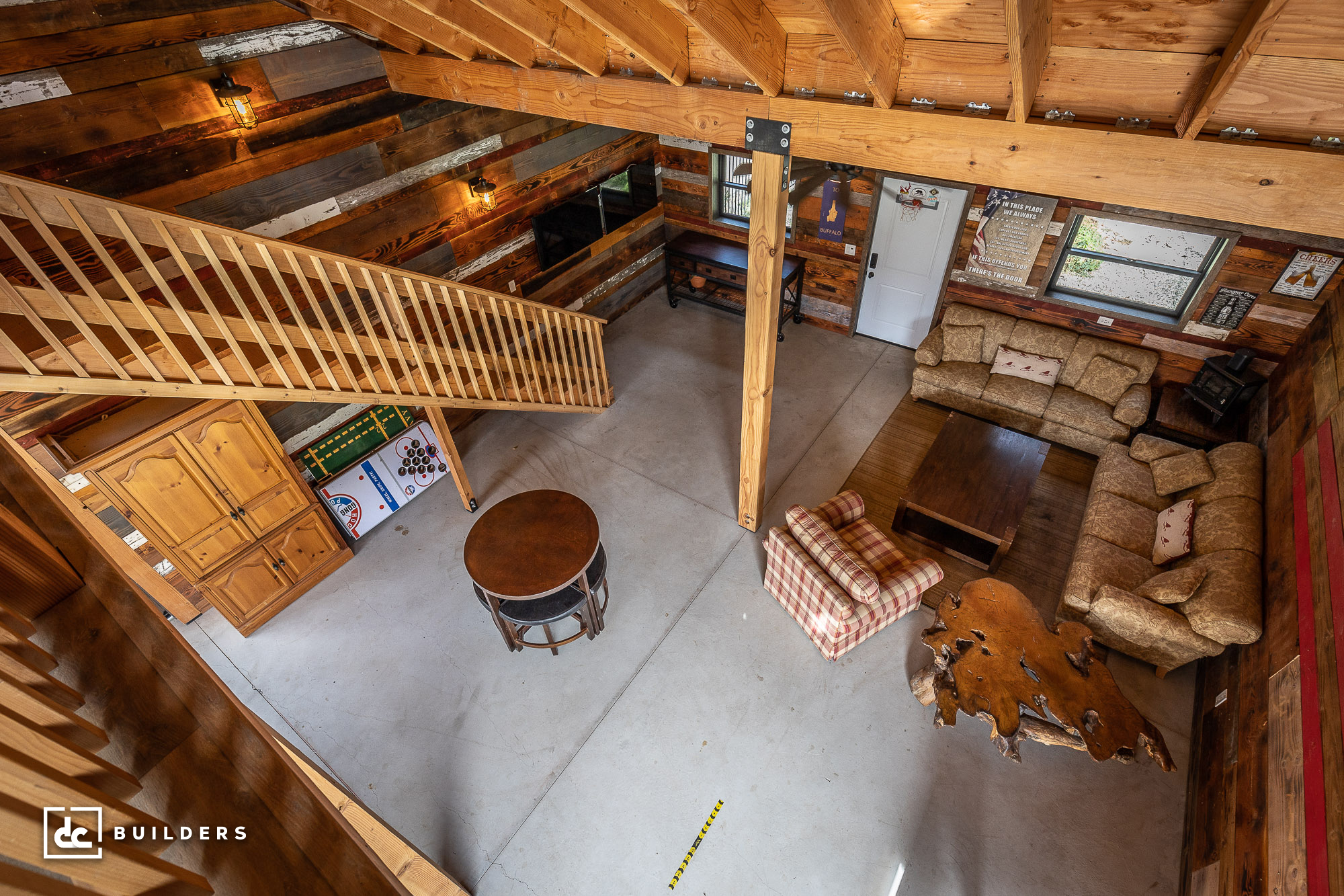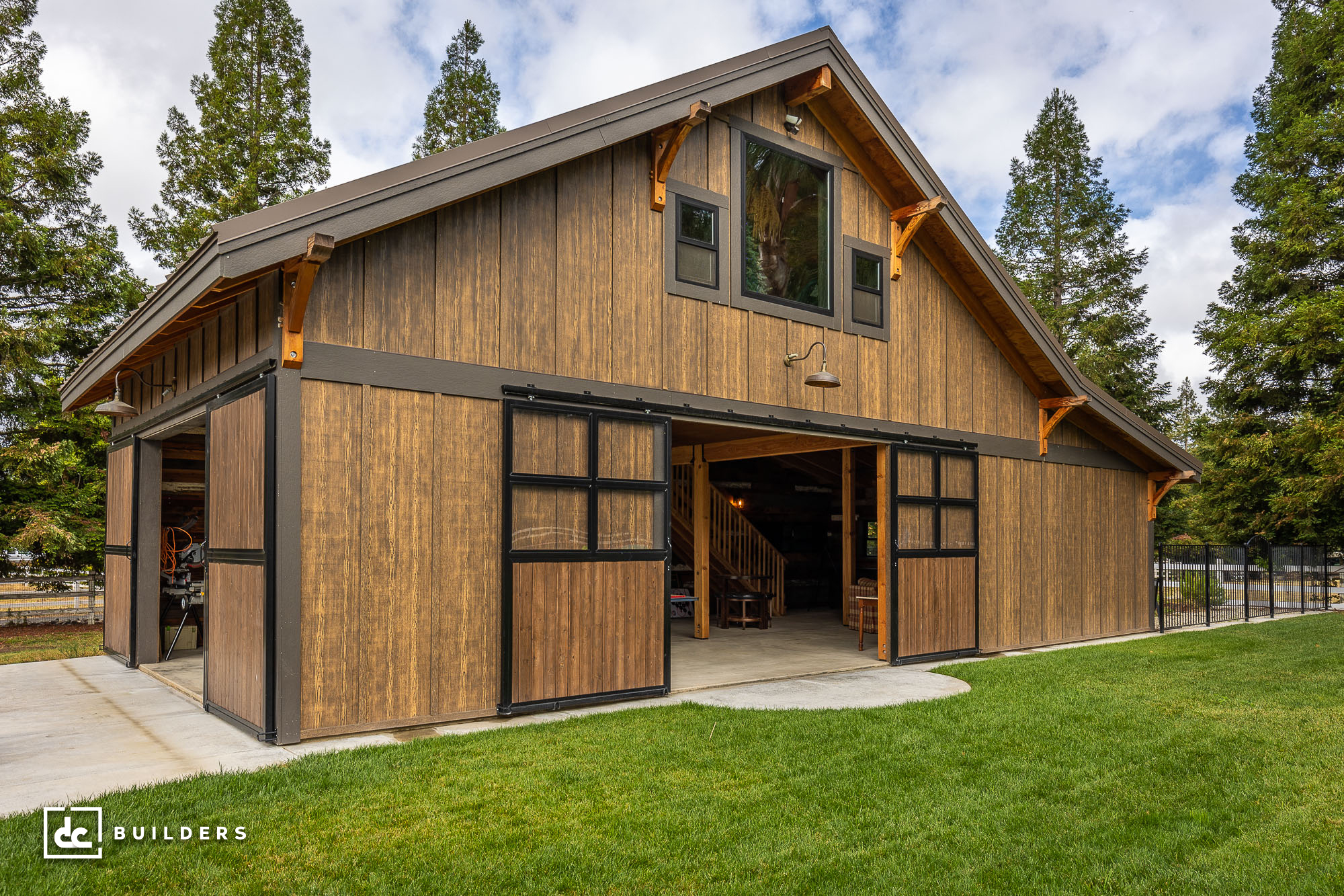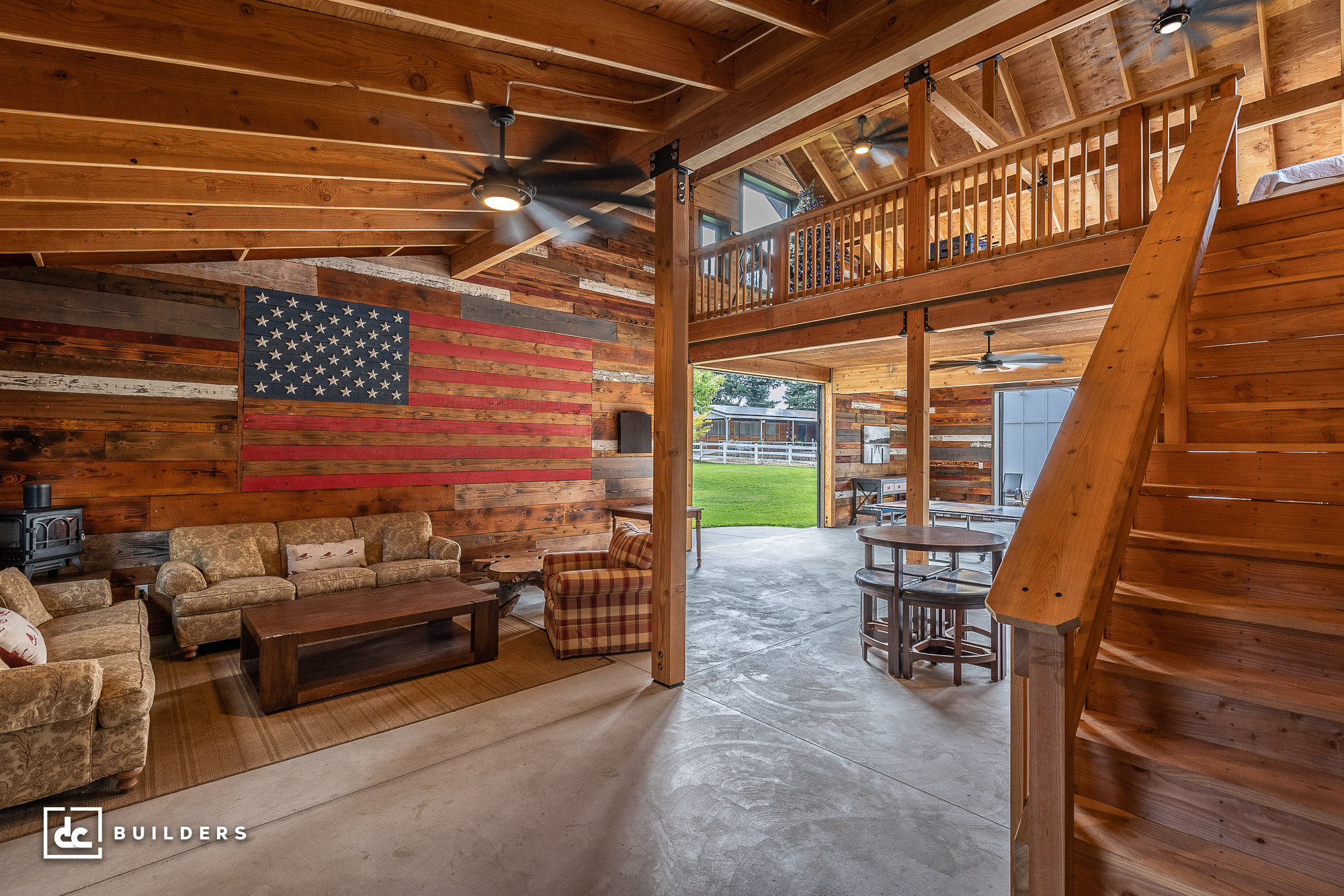 Based on a Columbia 24′ Gable Barn Kit from DC Structures, this cozy backyard barn offers the perfect setting for family fun and relaxation. We built this post and beam structure in collaboration with DC Structures, who designed the building and prefabricated its wood framing components. The barn features 1,462 square feet of flexible living space, including a 1,152 sq. ft. main level and a 310 sq. ft. loft. Though seemingly small from the outside, this impressive structure offers plenty of room for entertainment, lounging, and family gatherings inside the barn.