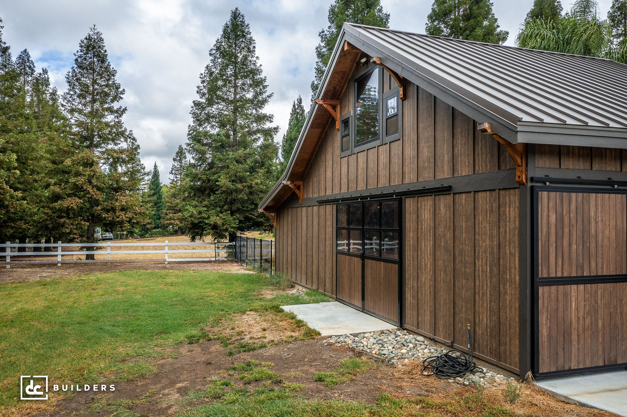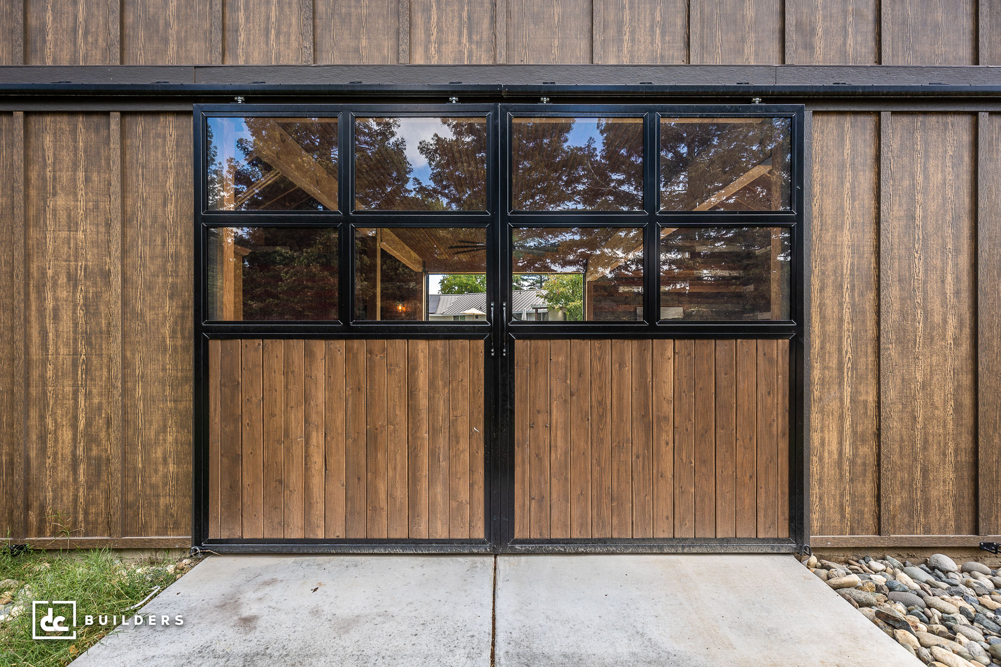 The talented designers at DC Structures made minimal modifications to the original model, including enclosing the shed roof and removing a set of columns on the first floor and a vented cupola above the barn. They also added quad-glass breezeway doors, Andersen 100 series fixed and single-hung windows, and HardieĀ® Panel board and batten siding in place of a few standard options. Other additions to this barn include tempered glass on the windows and black exterior and interior window trim. Our client also decided to incorporate reclaimed wood walls as a unique visual element that adds character and warmth.