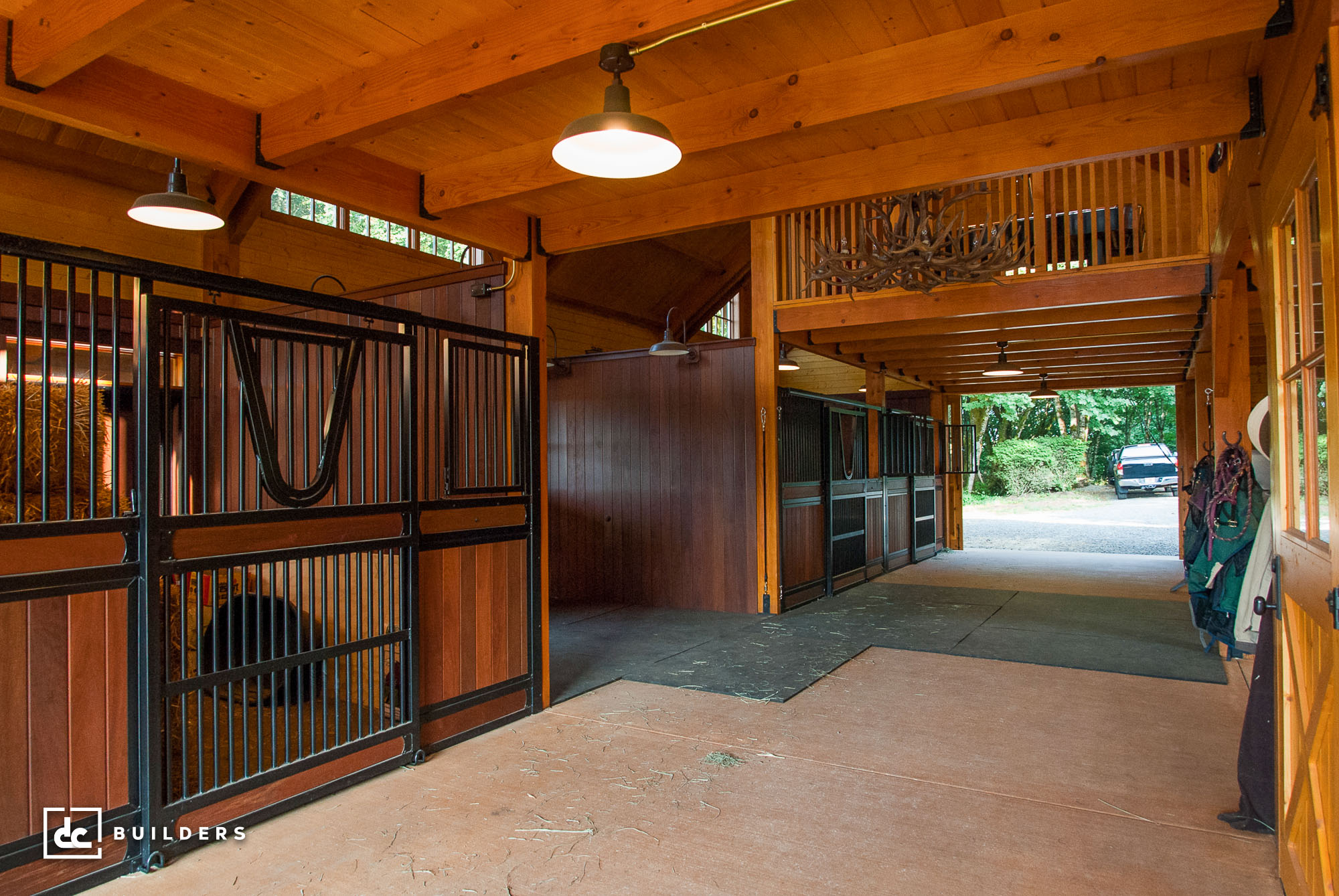 Custom features include entry doors from Portland Millwork and stall components by Classic Equine, including Brazilian hardwood-finished stalls with Nelson waterers and ComfortStall flooring. The main level also houses a spacious 12′ x 18′ tack room, while the upstairs entertainment loft features bunk beds for guests and a custom cupola for added light and ventilation. It’s a warm, functional space that brings together craftsmanship, comfort, and timeless barn-style design.